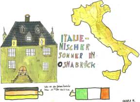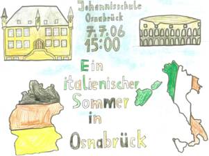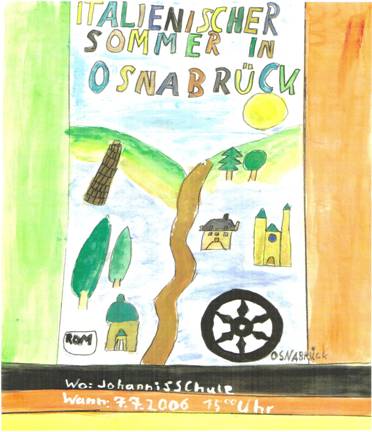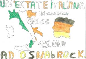 Tutta la scuola è stata coinvolta in questa festa e tutti avranno alcune ore di lezione sull’Italia. Tutti i bambini hanno presentato un disegno avente per tema : “Un’estate italiana ad Osnabück” ed i migliori sono stati scelti come manifesti da appendere in città (sono stati stampati) e sono stati usati anche come invito alle autorità della città.